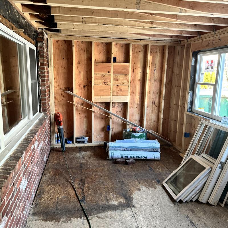 MC Design and Construction LLC is building a new four seasons front porch in Brookline, Massachusetts. The project includes installing an EPDM roof, new windows, and updated siding to improve function across all weather conditions.