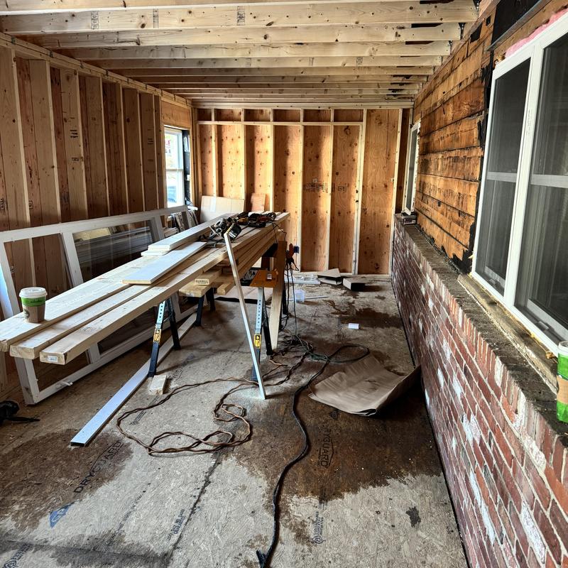 MC Design and Construction LLC began construction of a four seasons porch spanning the entire front elevation of a home in Brookline, Massachusetts. The project adds a weather-protected space suitable for year-round use, extending the home’s functional living area without altering its main structure.