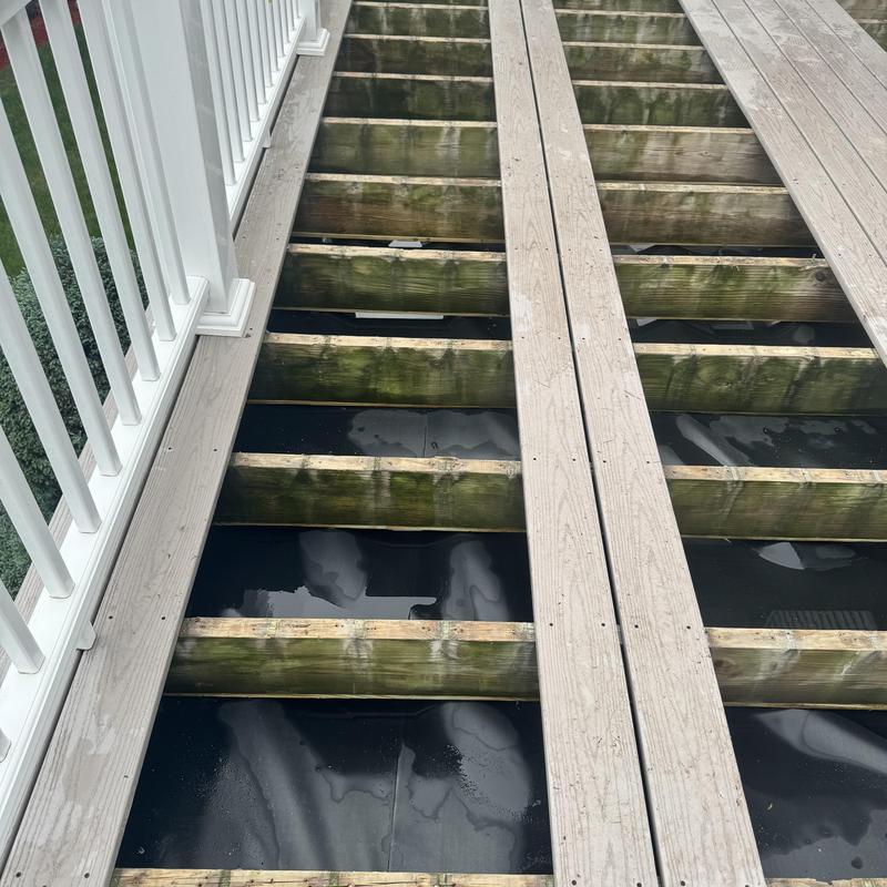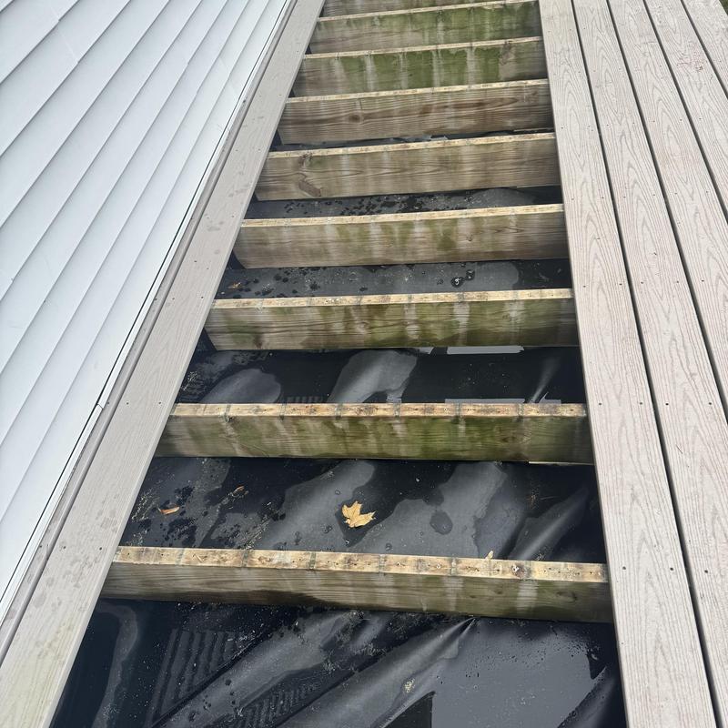 MC Design and Construction LLC installed a rubber roof beneath a deck to direct water into a new gutter system. The team also completed the deck ceiling using PVC sheets. This project took place in Waltham, Massachusetts.