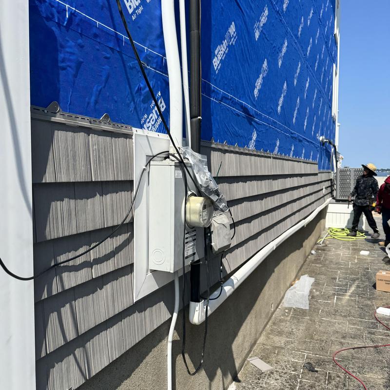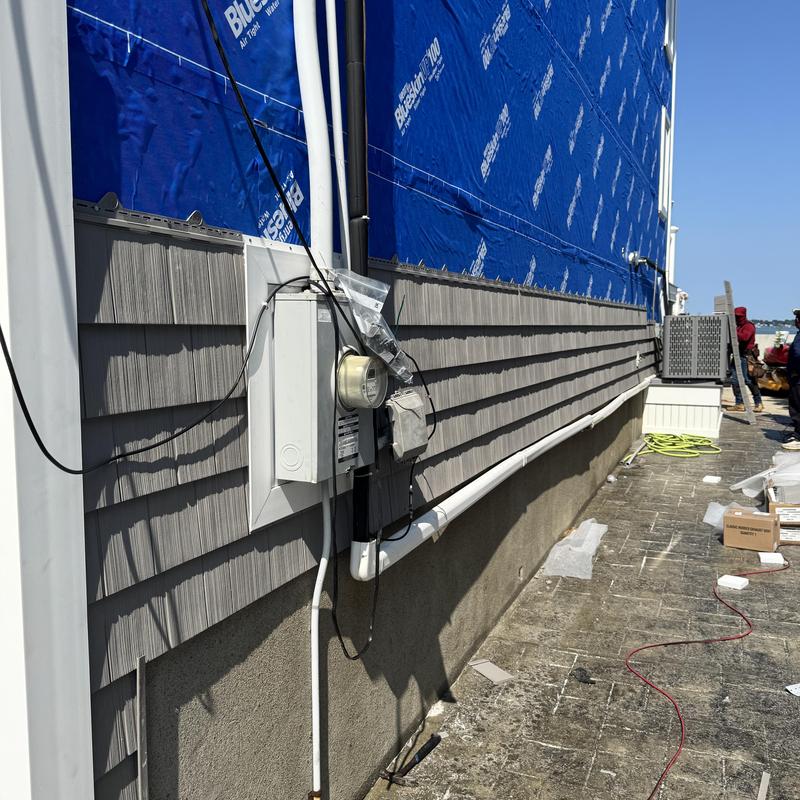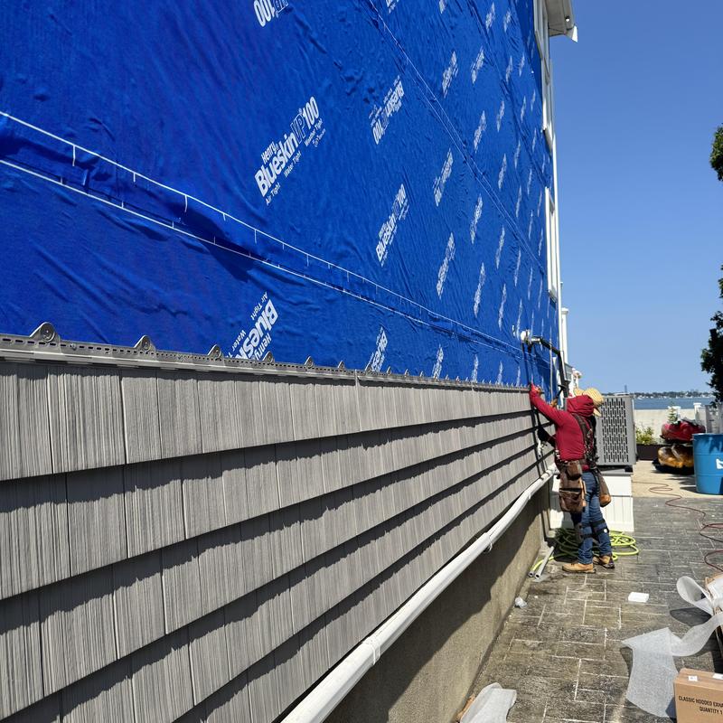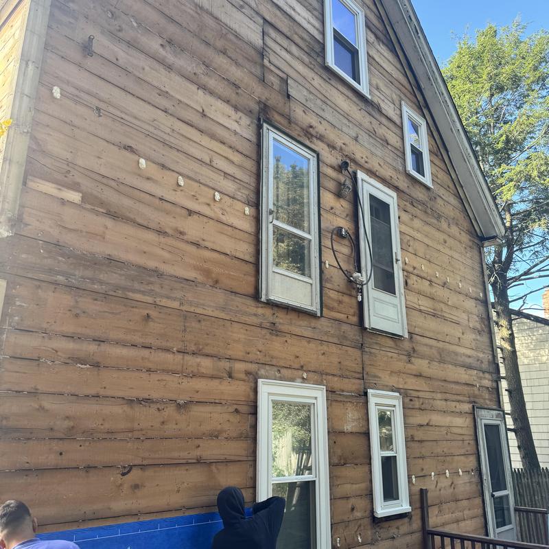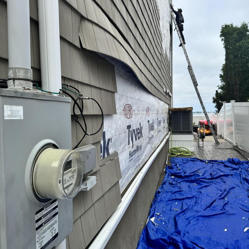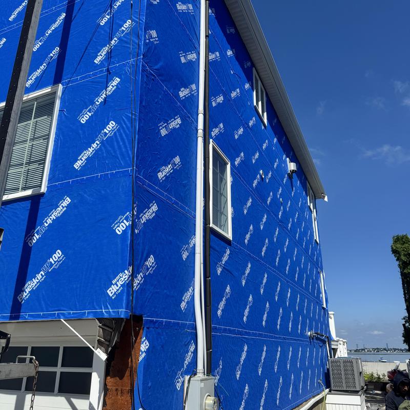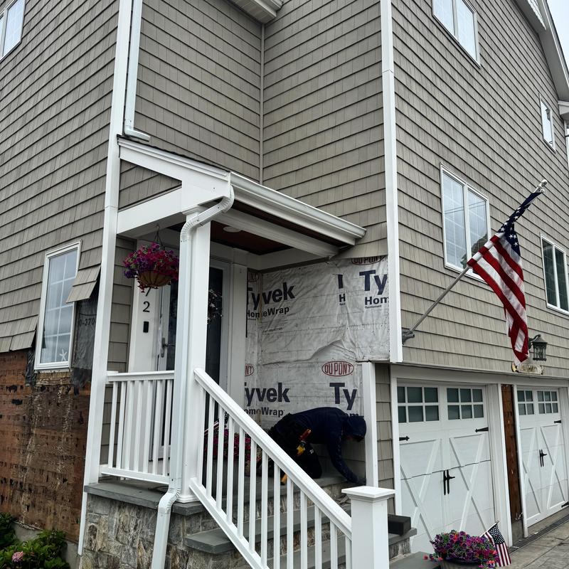 MC Design and Construction LLC removed old siding, repaired damaged decking, applied blue skin house wrap, and installed new siding with PVC trims in Weymouth, Massachusetts. This service ensured stable structural support and proper moisture protection for the exterior walls.