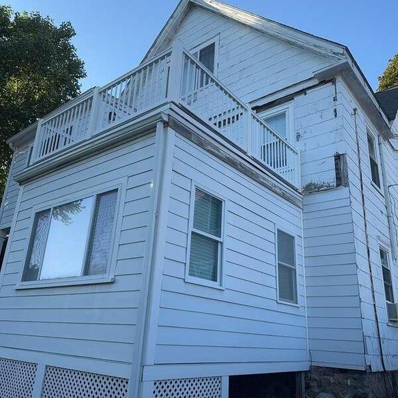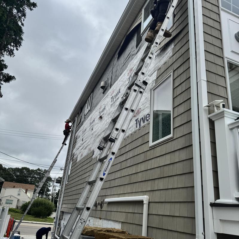 MC Design and Construction LLC removed old wood shingle siding and installed new vinyl siding on a residential property in Weymouth, Massachusetts. The project improved the home's exterior protection and updated the surface with durable, low-maintenance materials.
