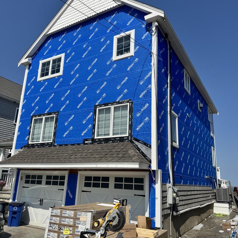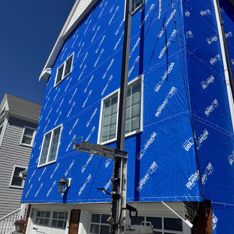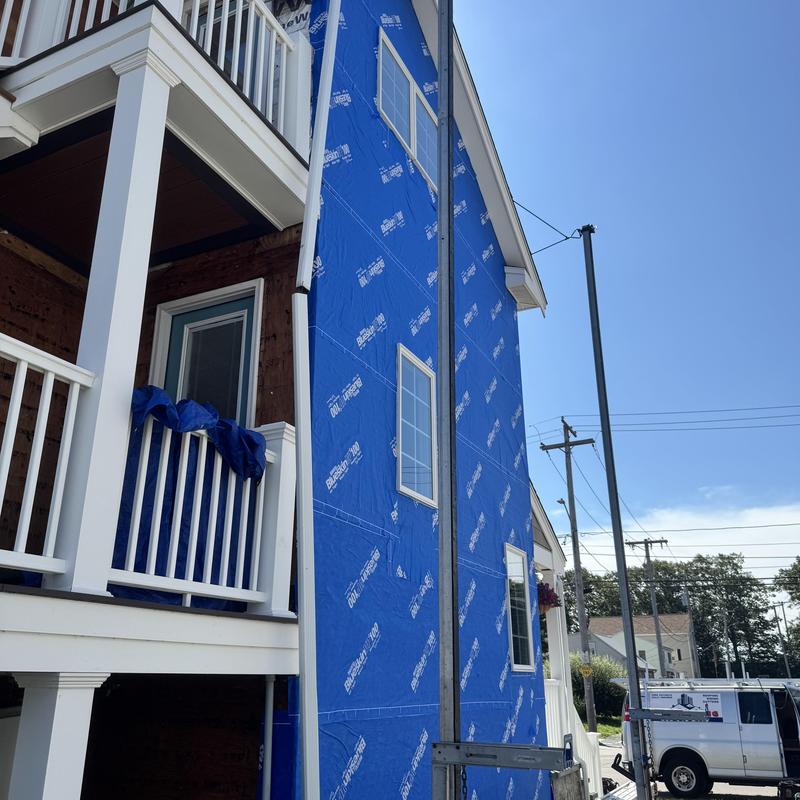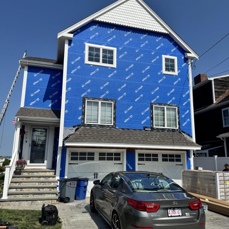 MC Design and Construction LLC removed old siding, inspected the decking, replaced damaged boards, applied blue skin house wrap, and installed new siding with PVC trims in Randolph, Massachusetts.