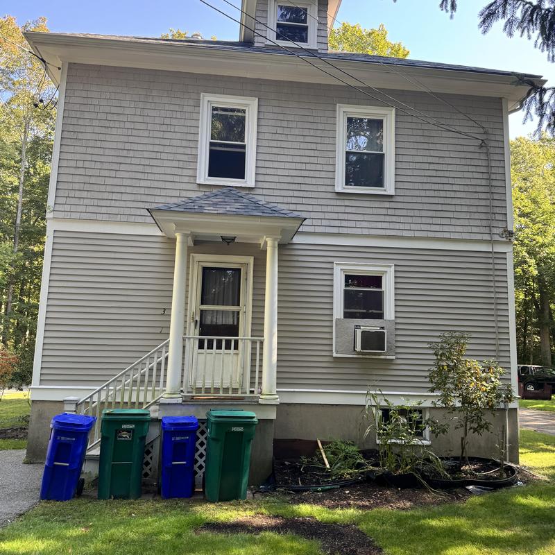 MC Design and Construction LLC removed existing siding and installed composite siding with shingle accents on the peaks for added contrast. This exterior upgrade took place in Waltham, Massachusetts.